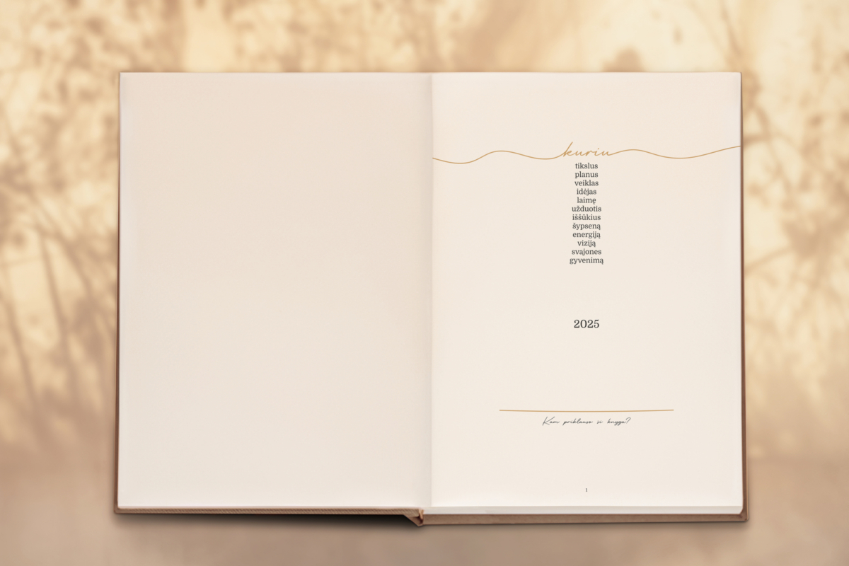 - Minimalistiniu stiliumi užrašytas „Kuriu“ pavadinimas ir knygos šone „2025“ metai su įspaudu.