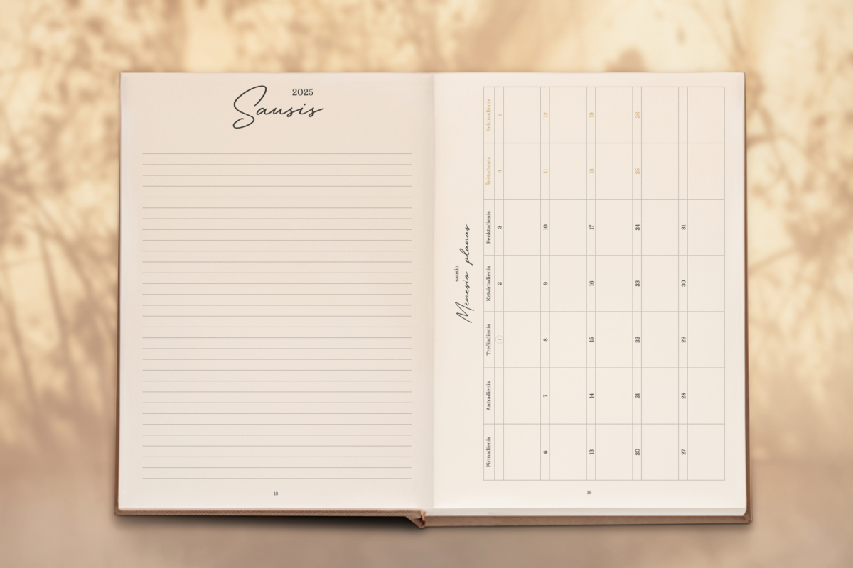 - Kiekvienas mėnuo prasideda su: lapu užrašams, to mėnesio planuokliu (lentelės forma) ir kiekvienos dienos darbų planuokliu (visos dienos po pilną puslapį).