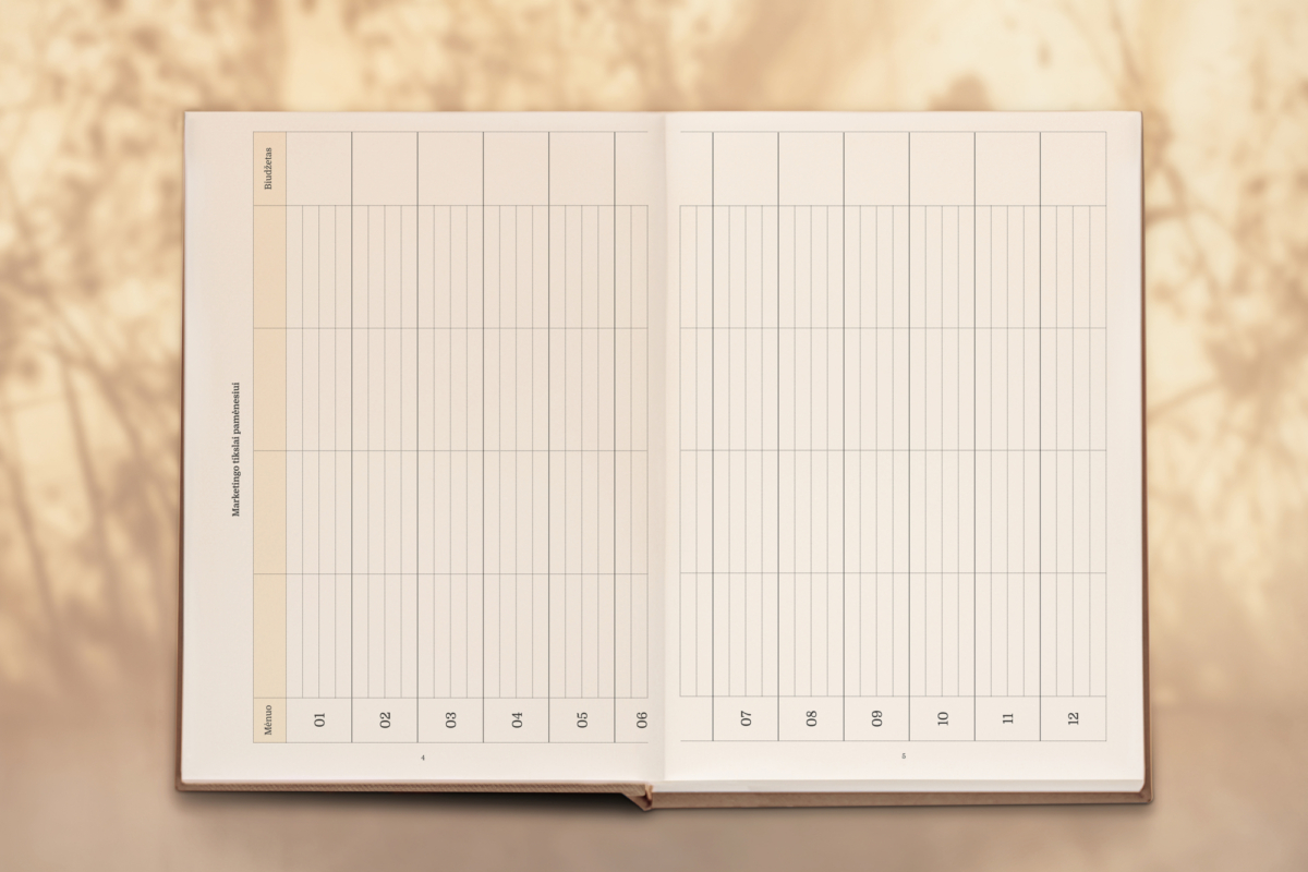 Minimalistinio dizaino „Kuriu“ planuoklyje sudėti tik esminiai ir svarbiausi puslapiai. Šioje knygoje viskas sukoncentruota į Jus ir Jūsų veiklą. Galėsite išsikelti visų metų savo veiklos marketingo tikslus, pasižymėti mėnesio pajamas, patogiai susiplanuoti komunikacijos planą ir žymėtis visus užsakymus bei jų etapus!