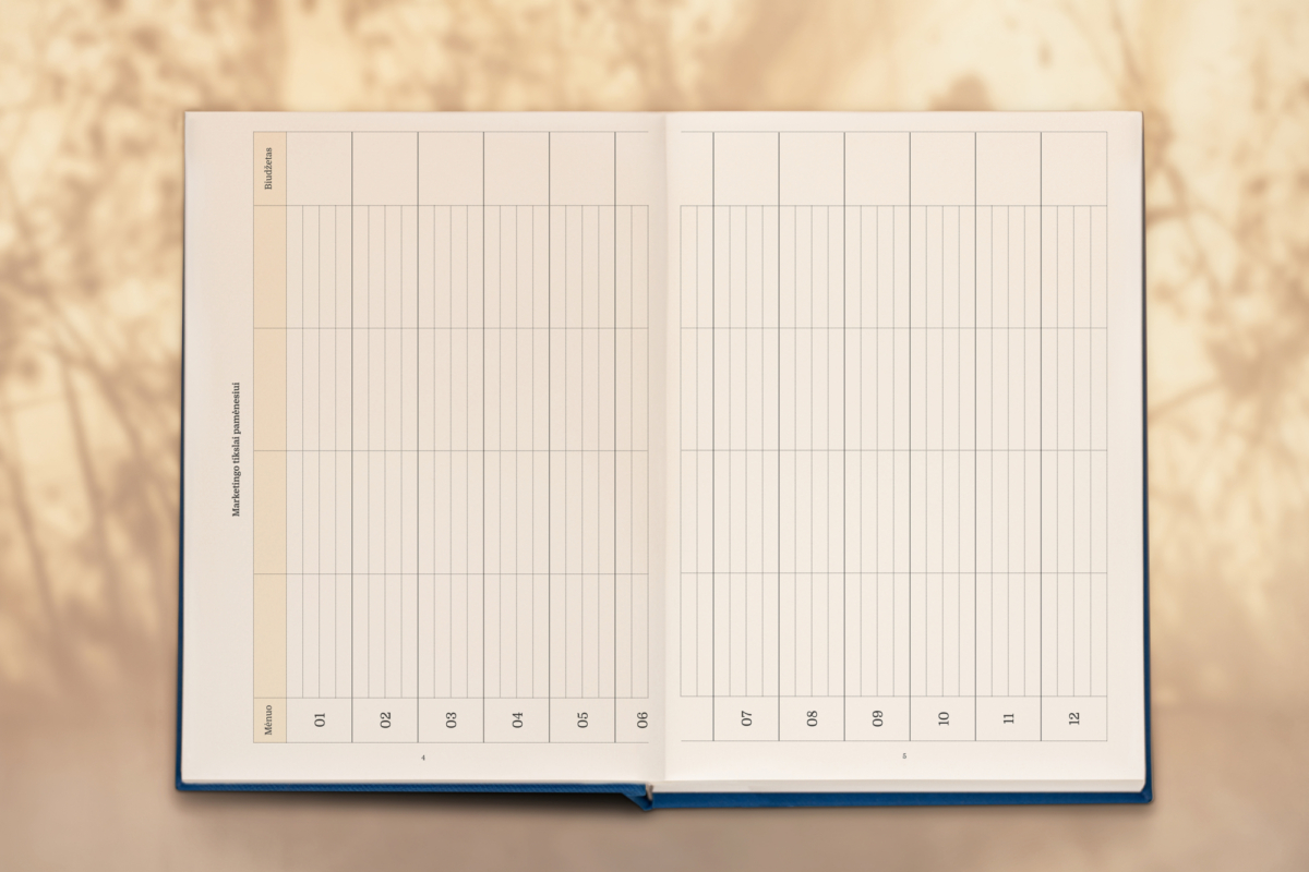 - Kiekvienas mėnuo prasideda su: lapu užrašams, to mėnesio planuokliu (lentelės forma) ir kiekvienos dienos darbų planuokliu (visos dienos po pilną puslapį).
