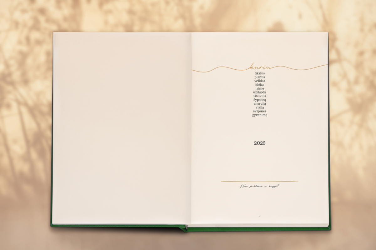 - Minimalistiniu stiliumi užrašytas „Kuriu“ pavadinimas ir knygos šone „2025“ metai su įspaudu.