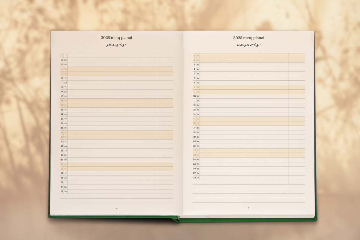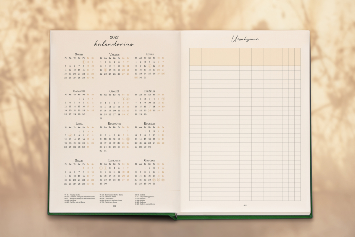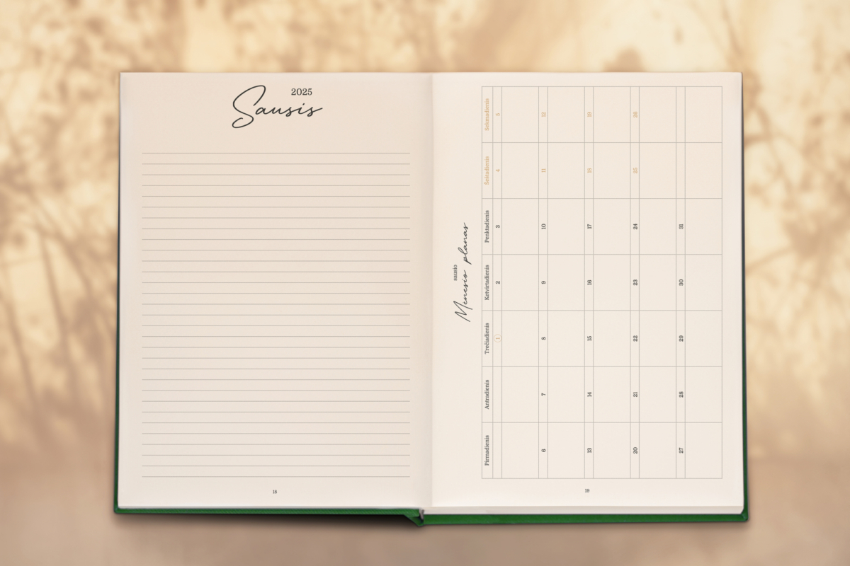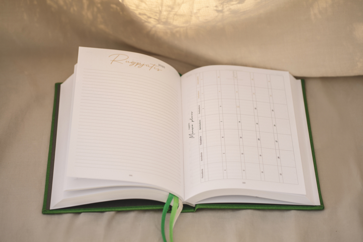 - Kiekvienas mėnuo prasideda su: lapu užrašams, to mėnesio planuokliu (lentelės forma) ir kiekvienos dienos darbų planuokliu (visos dienos po pilną puslapį).